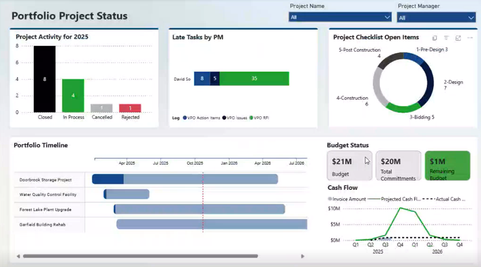 VPO integrates seamlessly with Power BI allowing all the information mentioned above to be displayed in a comprehensive dashboard. This reporting tool also allows filtering by project, phase, manager, or type, we well as create roll-up reports for stakeholders.