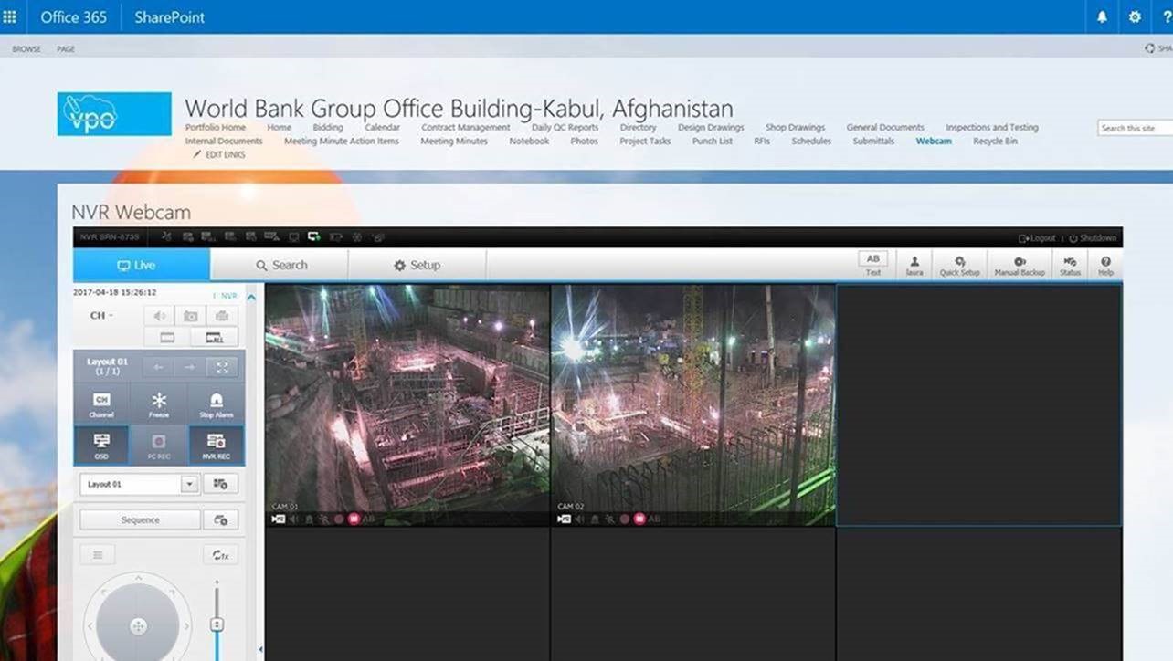 The project manager of the World Bank Group asked us to incorporate the CCTV Webcam directly into VPO so that the project team could view the job site while logged into VPO, where they are managing other project data. We offer VPO on SharePoint Online through Office 365 and discovered we could add a Page Viewer Web Part to our SharePoint site to display the browser software provided by the manufacturer for viewing the Webcam on the page. Our setup even includes the controls for interacting with the live video feed—such as selecting the camera, zooming in, and panning the job site.